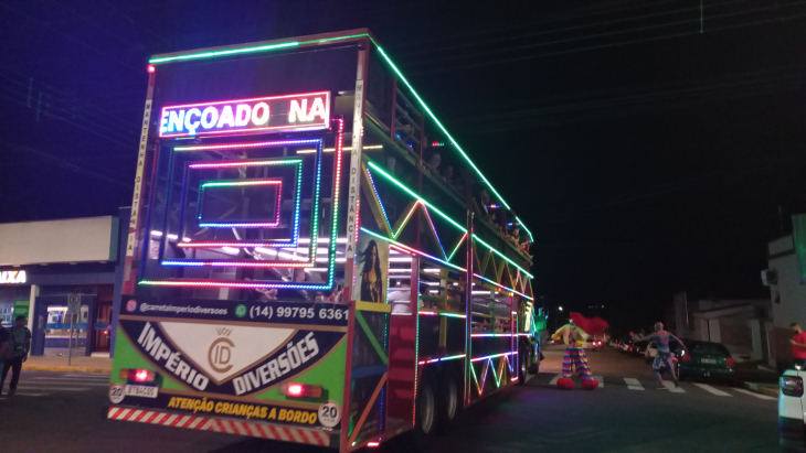 Com suas luzes encantadoras, músicas animadas e personagens, a carreta percorreu a cidade trazendo alegria e diversão para crianças e adultos.